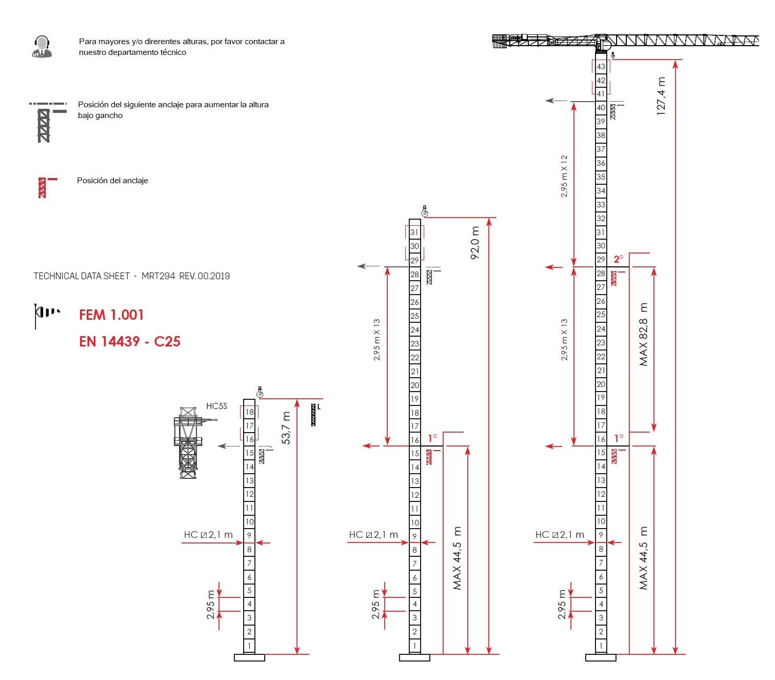 La MRT294 Grúa Torre Topless con HUH 62.5 m capacidad máxima de 16 ton, radio máximo 76 m y una altura hasta(2) 127.4 m; es uno de los modelos mas populares, entre los contratistas generales y desarrolladores, en obras con sistemas prefabricados.